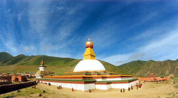 Towards the end of the millennium, Orgyen Kusum Lingpa, his son Hungkar Dorje Rinpoche, and the monastic and lay communities of Lung Ngon Thubten Chokhor Ling Monastery in Golog, as well as numerous people from all over the world and all walks of life, participated in the construction of the great stupa for world peace.